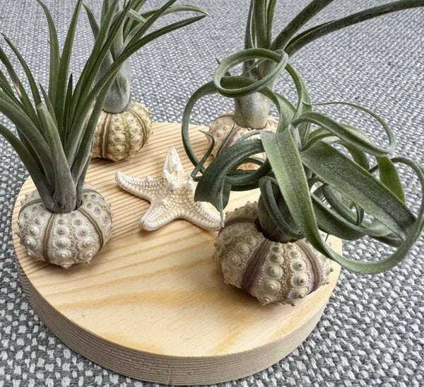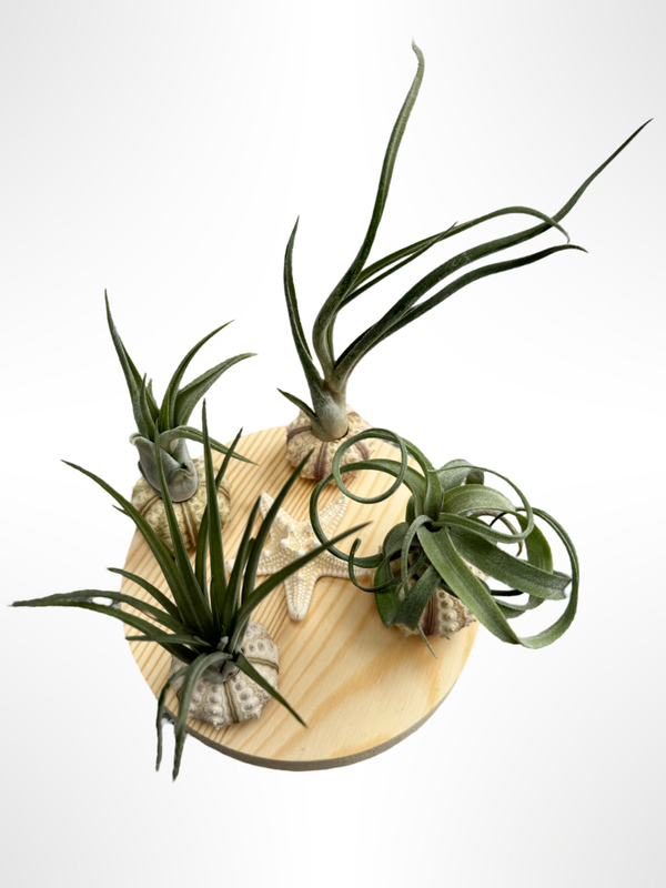 Een robuust houten plankje, met een doorsnede van 15 centimeter, met 4 verschillende soorten Tillandsia in een Sputnik zee-egeltje, en in het midden een schattig zeesterretje.