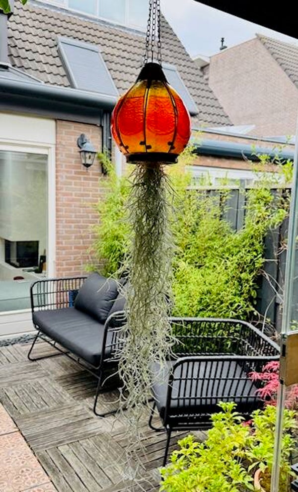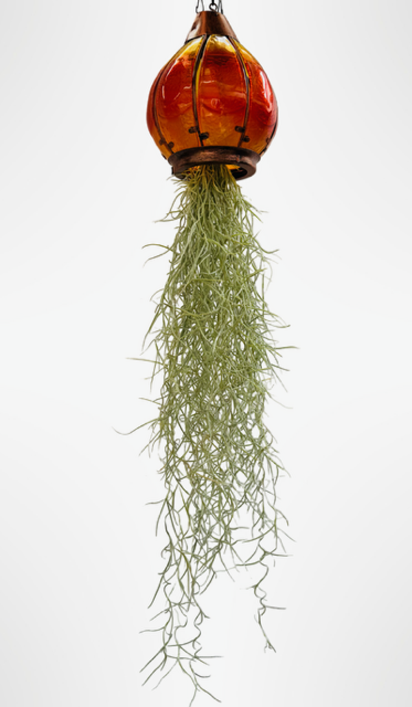Een prachtig ornament van stevig handgeblazen glas dient als decor voor een mooie bos Tillandsia Usneoides, ofwel Spaans mos.