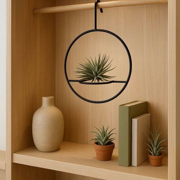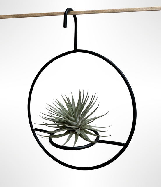 Een prachtige zwartmetalen hangring met daarín weer een ring waarop de Tillandsia Vriesea Espinosa rustig ligt.
