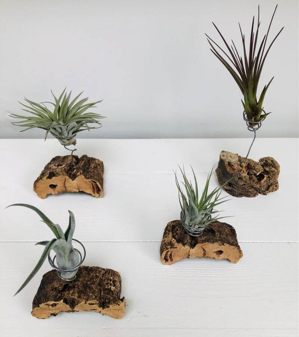 Tillandsia in een houdertje op een stukje kurkeikstam.