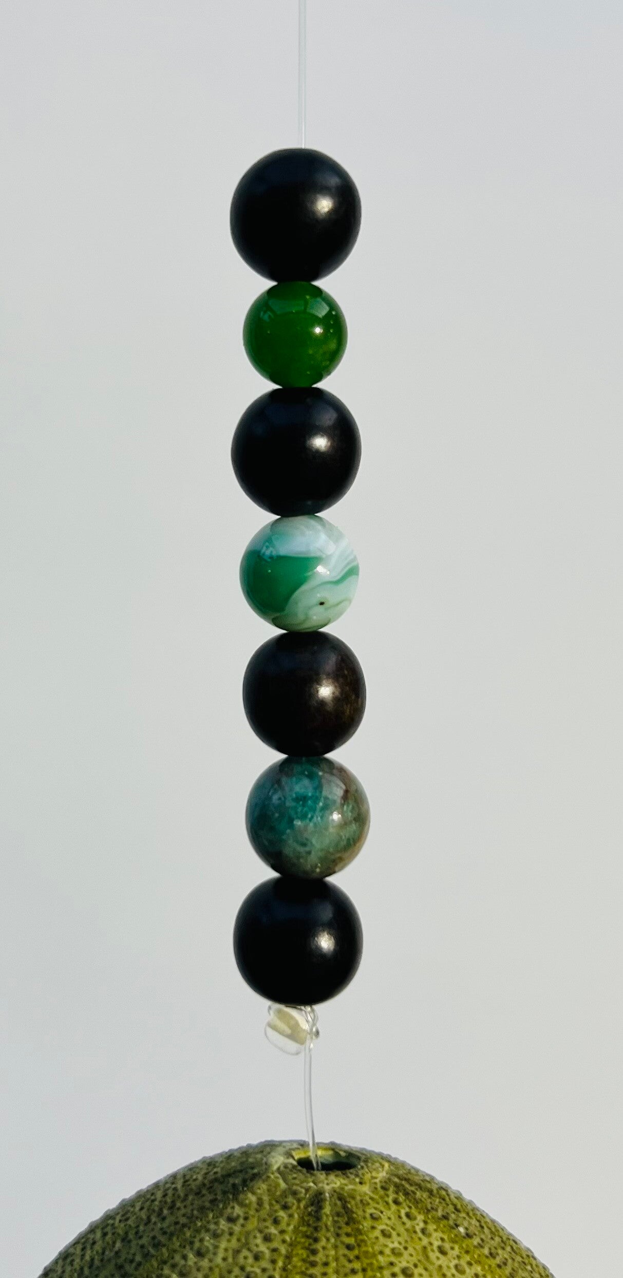 -Groene zee-egel met kralen van hout (zwart), Agaat groen, Taiwan Jade & Apetite AB.